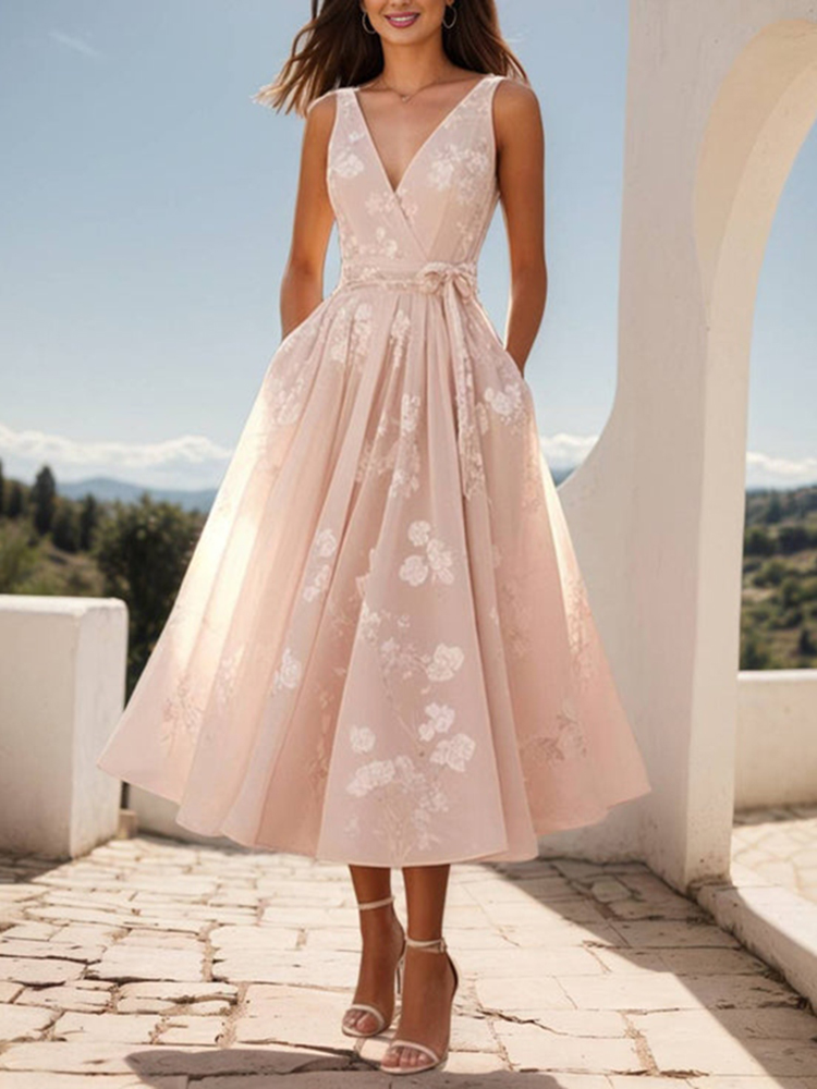 Women's Bow Belt Digital Print Sleeveless V-neck Midi Dress