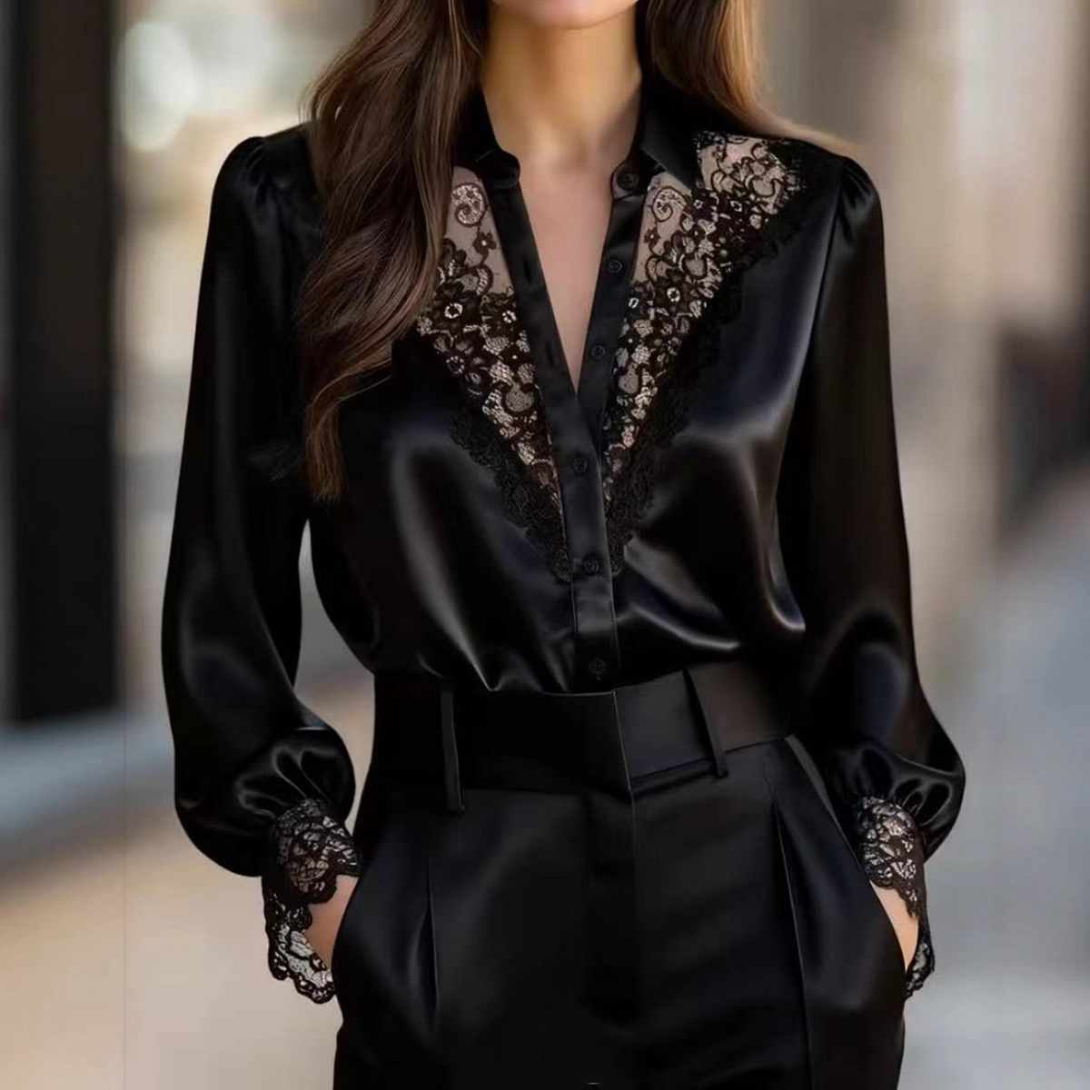 Fashion Patchwork Lace V-neck Puff Sleeve Shirt